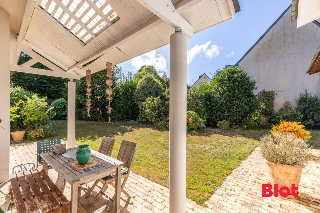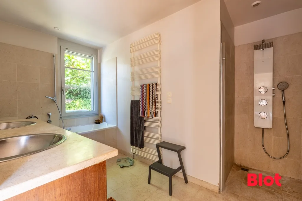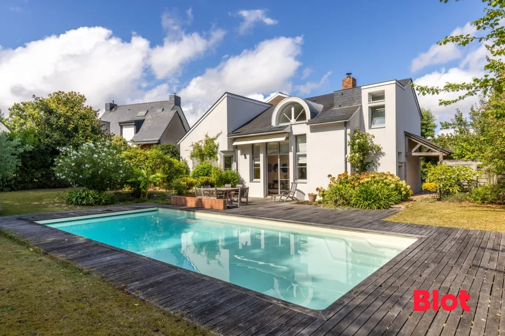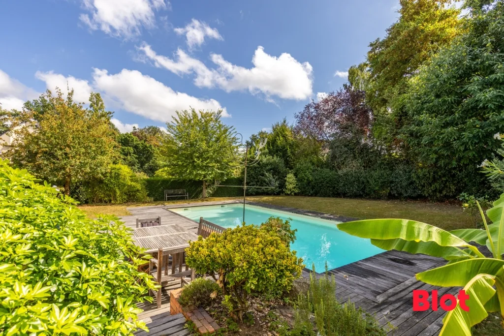 Son grand jardin paysagé et arboré, accueille une piscine chauffée.