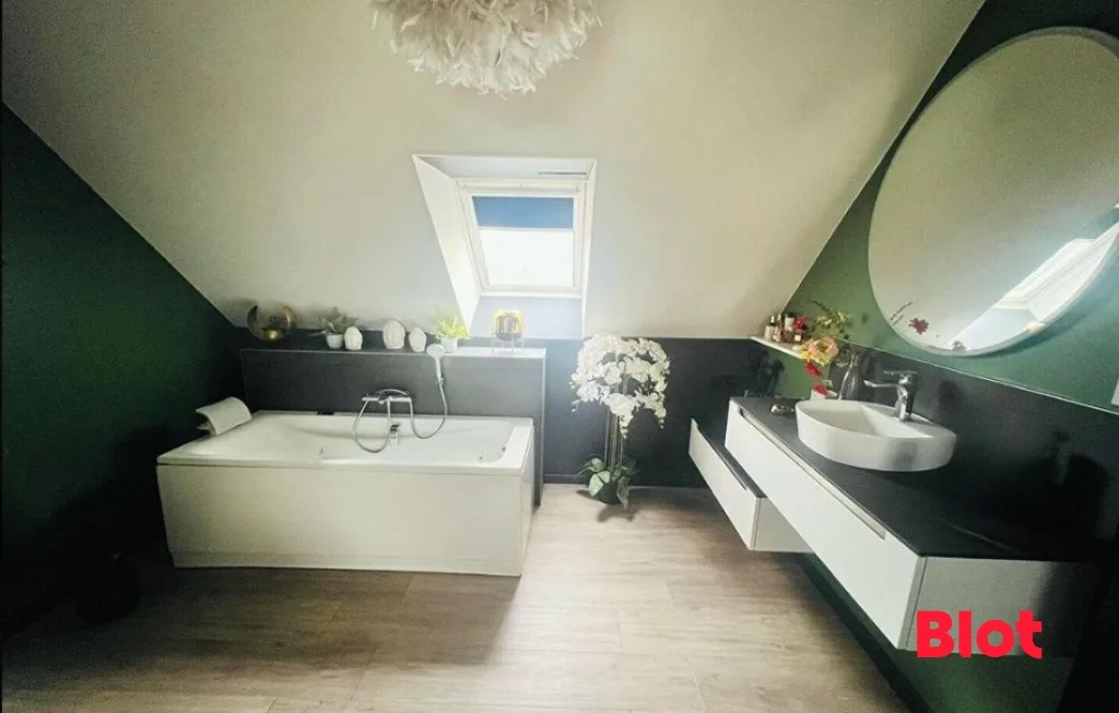 A l'étage, 2 chambres : une très grande avec une partie détente (baignoire et grande vasque) et un immense dressing, la 2ème avec grands placards. Une salle d'eau, des WC séparé et un grenier aménageable.
