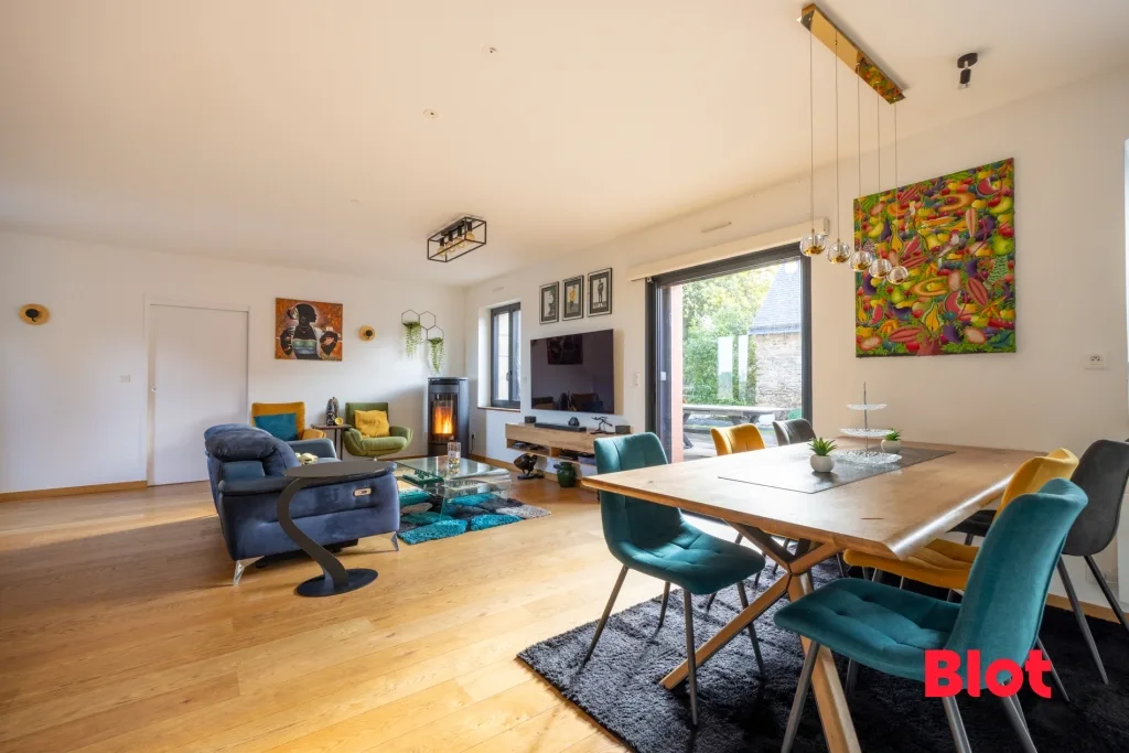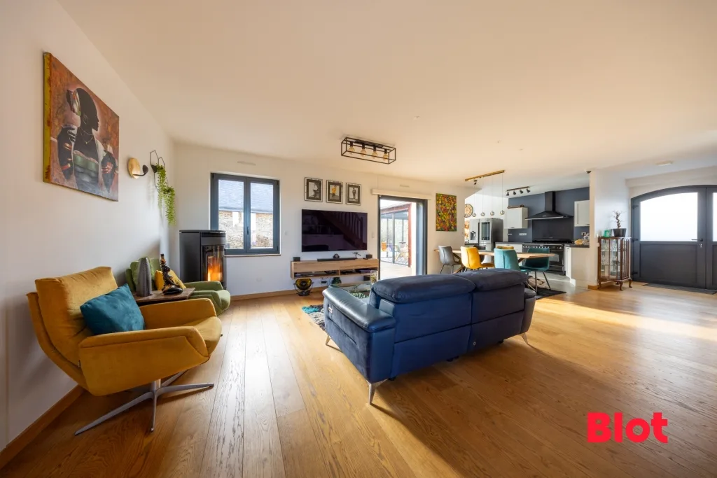Au rez-de-chaussée, l'entrée s'ouvre sur une vaste pièce de vie lumineuse avec poêle à bois ouverte sur la terrasse plein Sud. La cuisine, entièrement aménagée et équipée, communique avec une salle à manger en extension de type verrière. Une suite parentale avec salle d'eau ainsi qu'un garage complètent ce niveau.