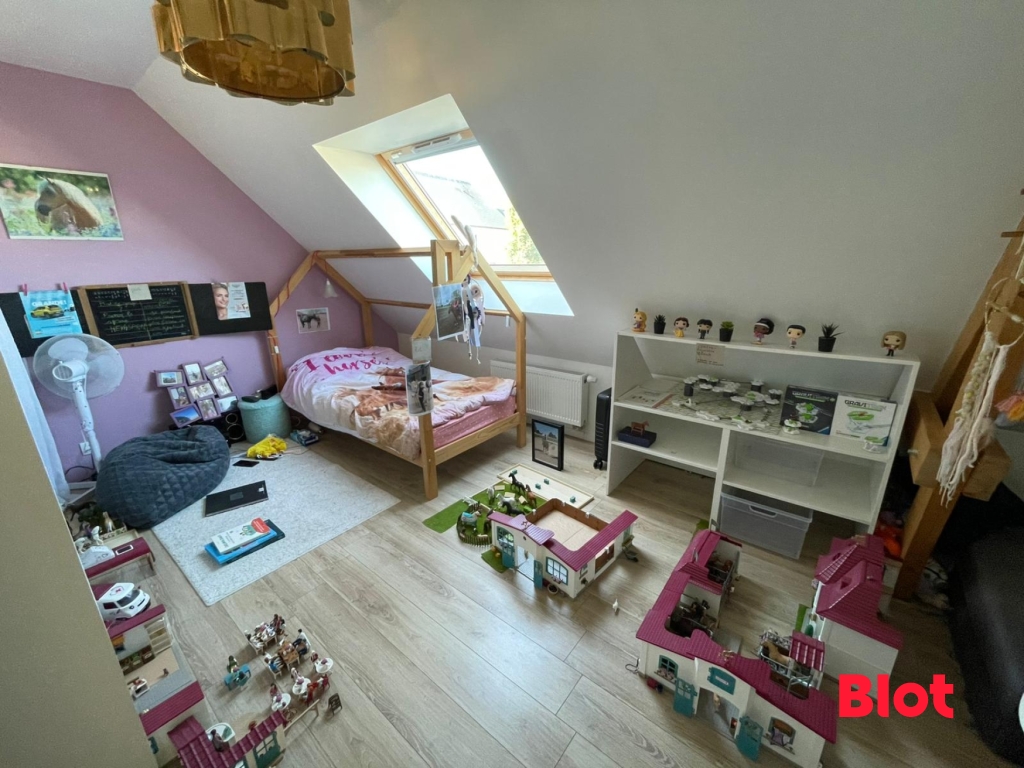 À l'étage, l'espace nuit se compose de trois belles chambres et d'une salle de bains, avec un second WC indépendant, offrant un cadre de vie pratique et harmonieux. Le garage attenant apporte une solution idéale pour le rangement.