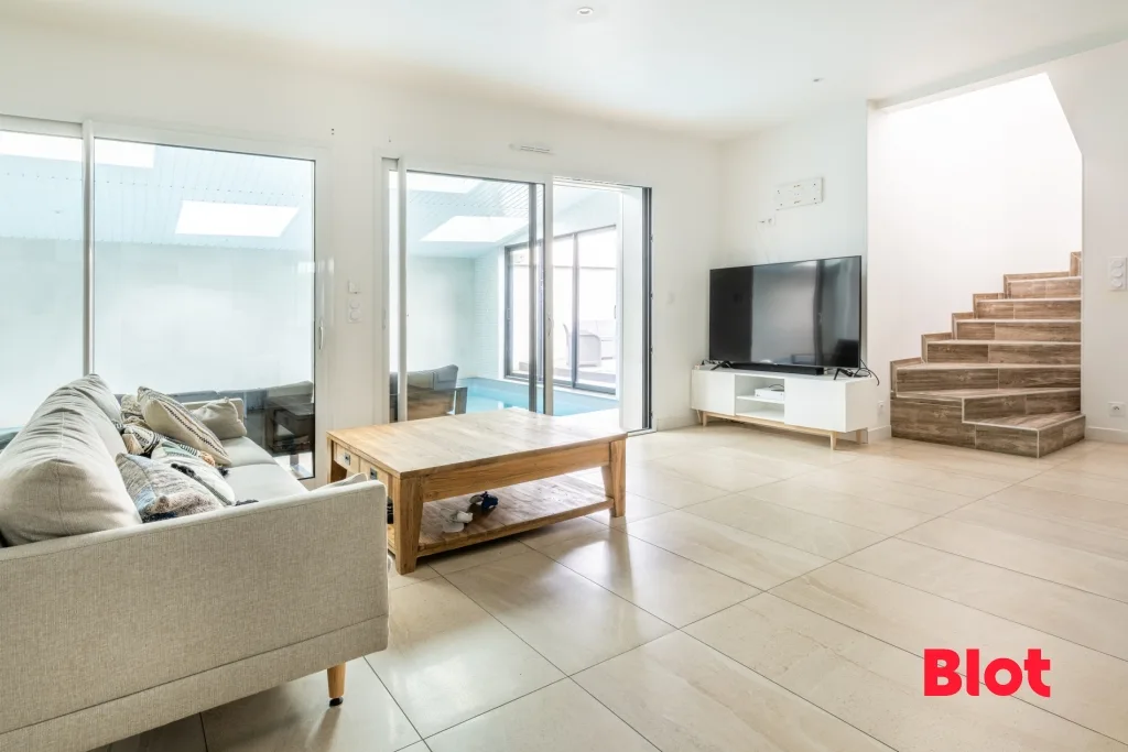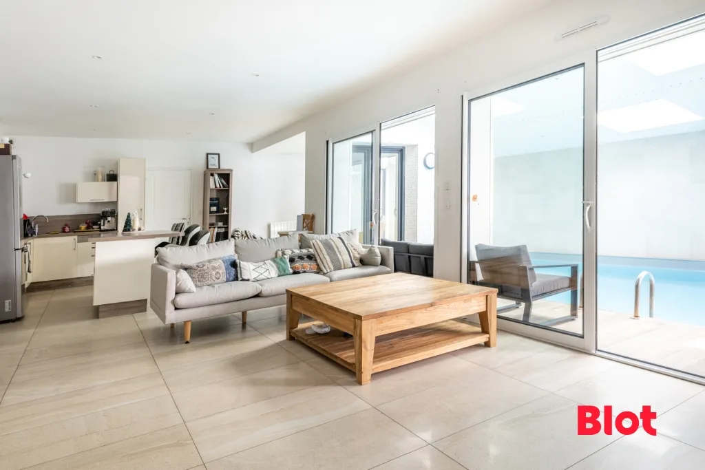 Le cœur de la maison est sans aucun doute sa magnifique pièce de vie, où l'espace salon-séjour s'ouvre sur une cuisine moderne, aménagée et entièrement équipée. Cet espace convivial bénéficie d'une vue directe et d'un accès vers la piscine intérieure, créant une ambiance unique, tout en offrant également une ouverture sur la terrasse extérieure, idéale pour prolonger les moments de détente aux beaux jours.