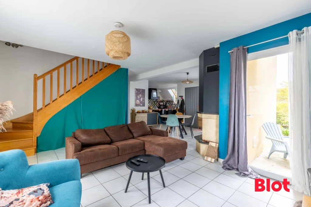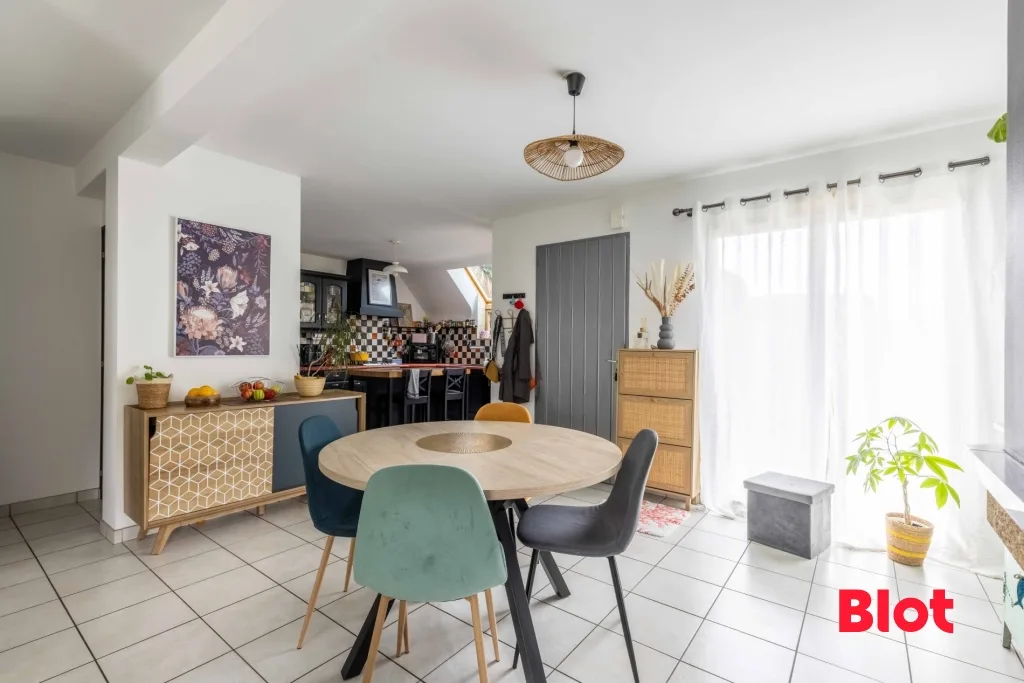 Dès l'entrée, l'atmosphère se veut accueillante et lumineuse. Le salon invite à la détente tandis que la salle à manger, sublimée par sa cheminée à foyer fermé, promet de doux moments au coin du feu lors des soirées d'hiver.