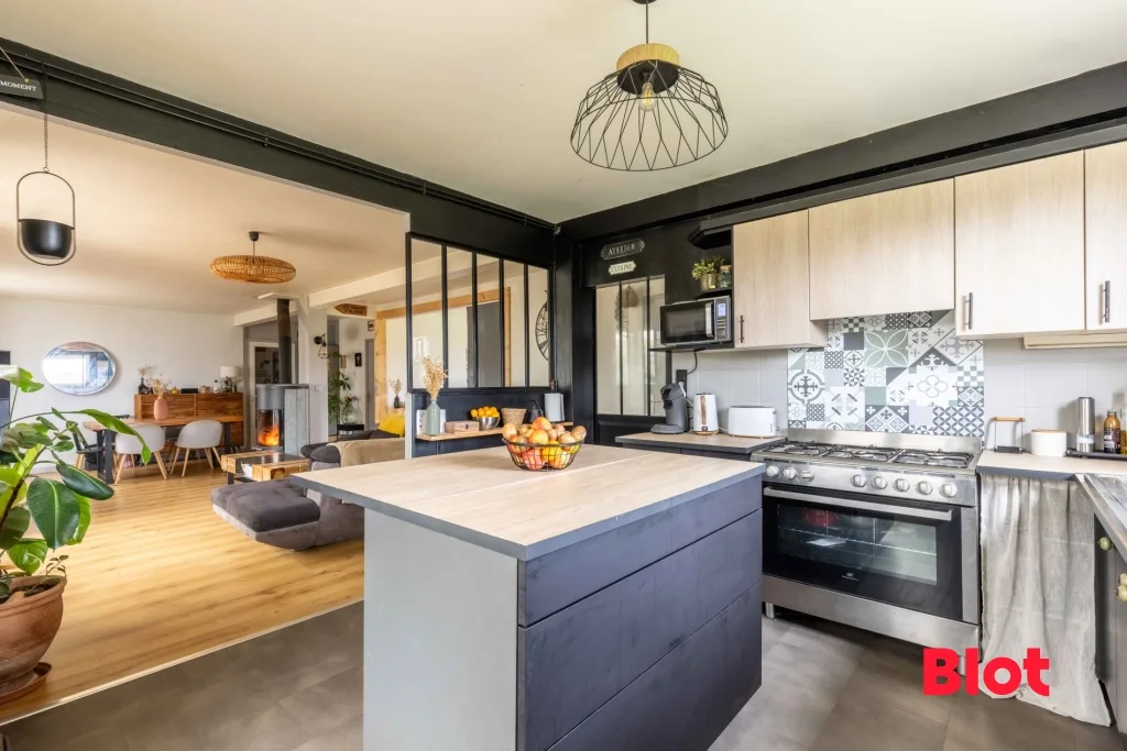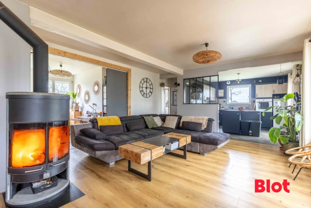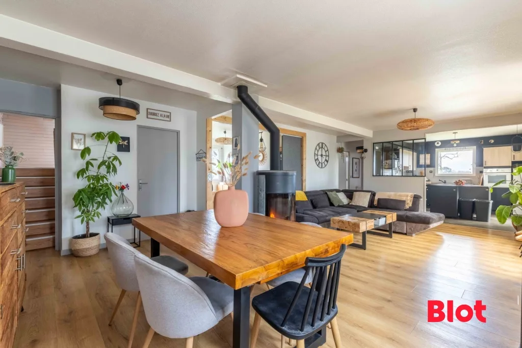 Au rez-de-chaussée, vous découvrirez une vaste pièce de vie lumineuse équipée d'un poêle à bois, idéale pour des moments conviviaux en famille. La cuisine aménagée et ouverte apporte fonctionnalité et modernité à l'ensemble.