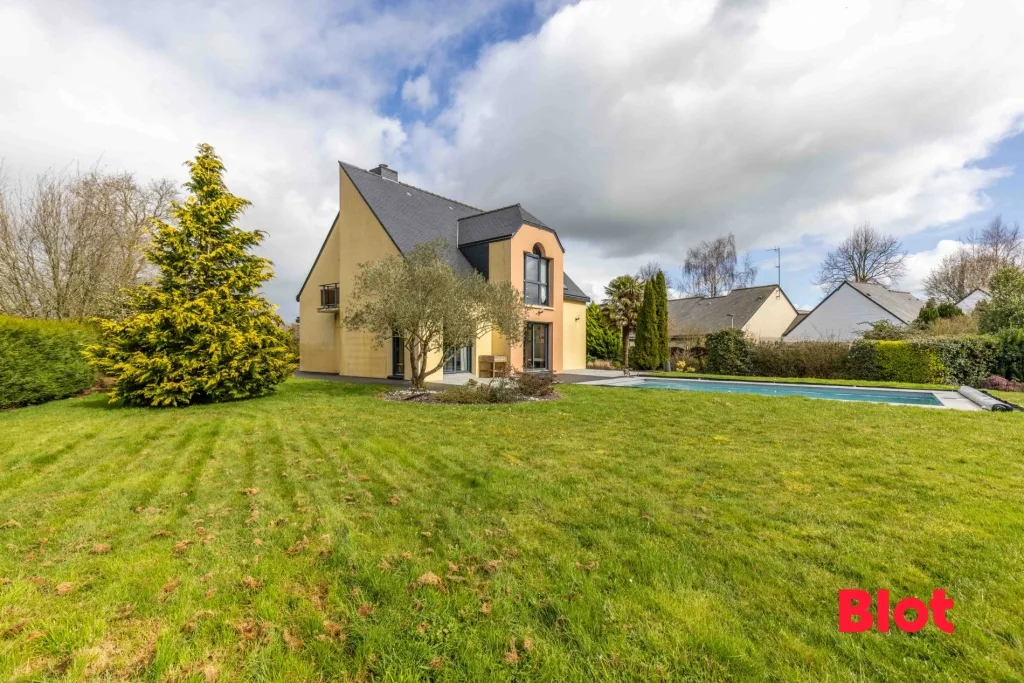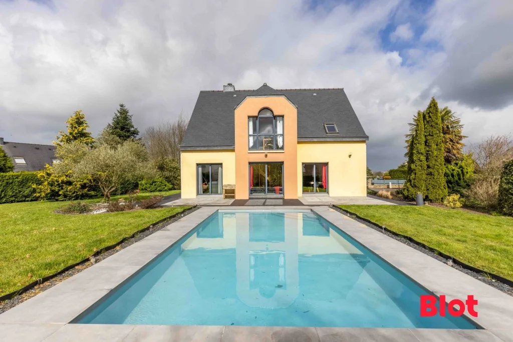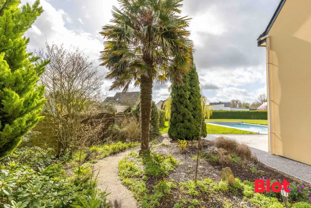 Le jardin paysagé accueille une grande piscine, idéale pour se détendre et partager de beaux moments aux beaux jours.