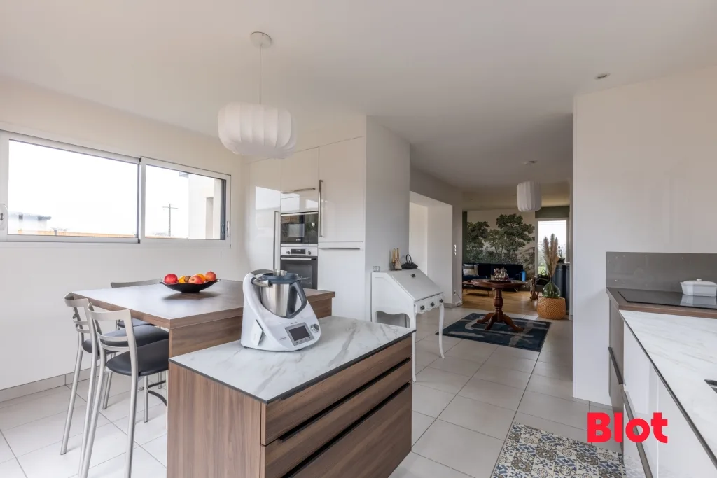 Une cuisine ouverte, aménagée et équipée avec accès direct à la terrasse.