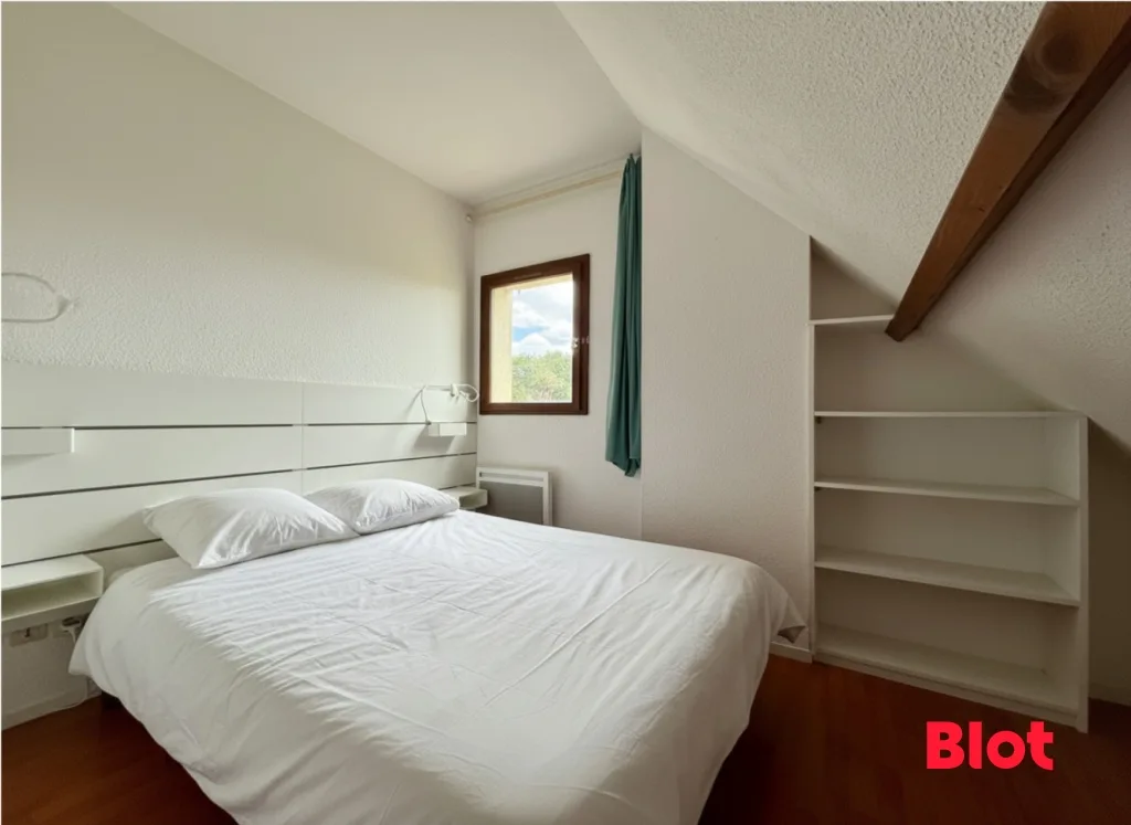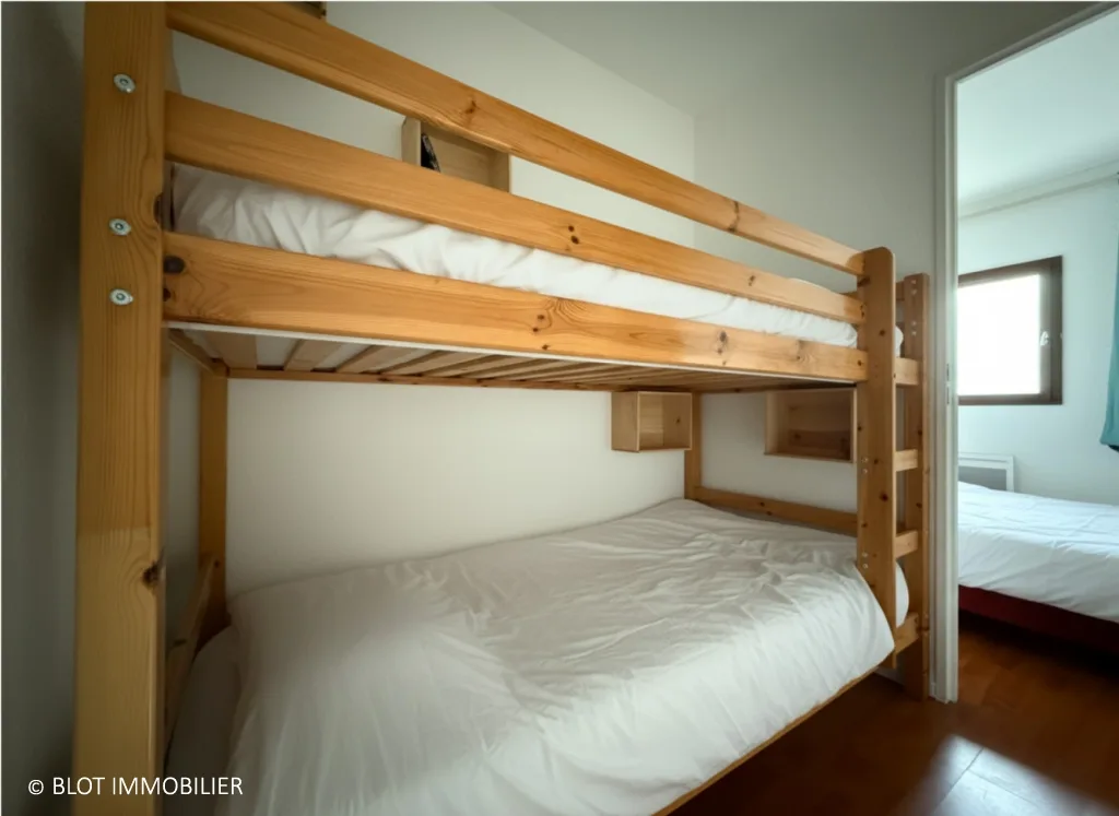 À l'étage, l'espace nuit optimisé propose un coin pouvant accueillir des lits superposés, parfait pour les enfants, ainsi qu'une chambre.