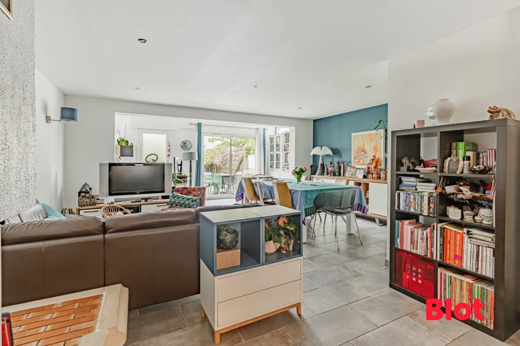 Elle bénéficie d'une belle pièce de vie traversante avec sa cuisine ouverte aménagée équipée donnant sur un jardin clos ensoleillé.