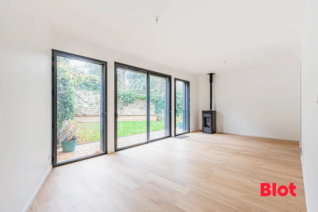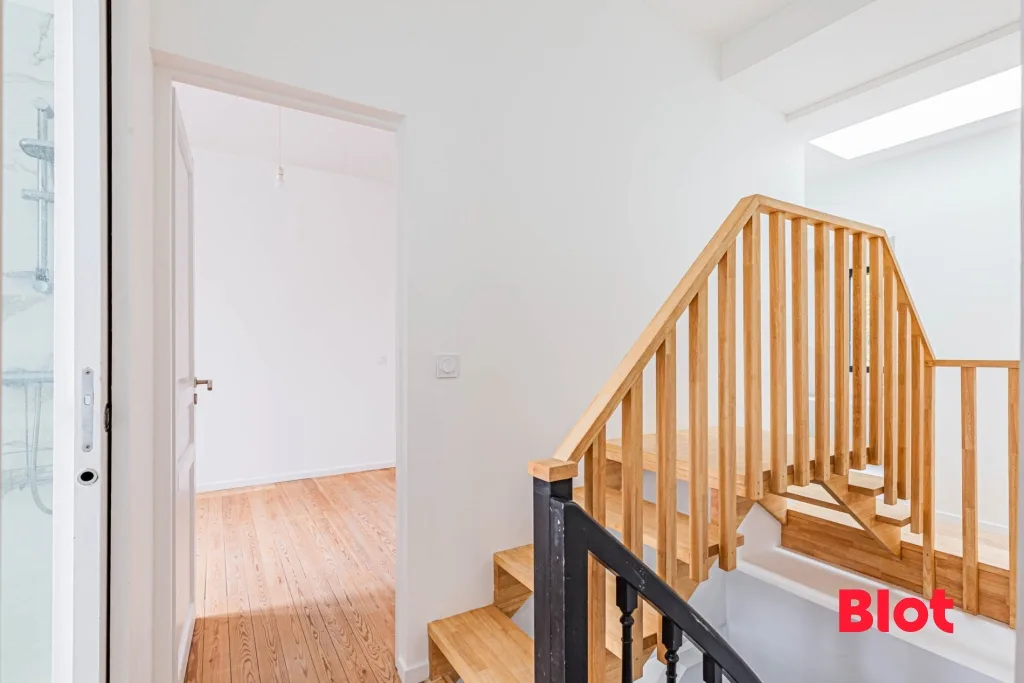 Lumineuse et fonctionnelle, vous apprécierez son agencement : dès l'entrée, la perspective sur le bel escalier du début du XXᵉ siècle vous séduira. Vous trouverez un premier espace salle à manger dans la partie ancienne, ainsi qu'une cuisine aménagée et équipée. Ces deux espaces permettent d'accéder à l'extension récente, baignée de lumière, où vous profiterez des larges baies vitrées donnant sur un espace extérieur exposé plein Sud.