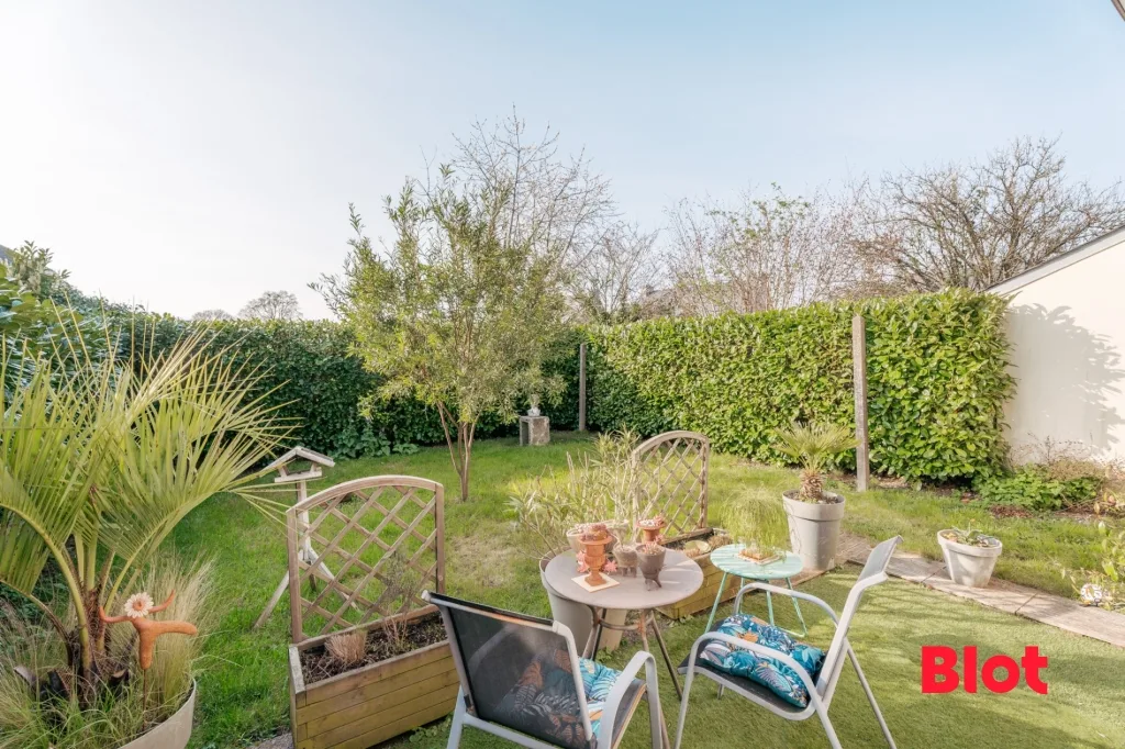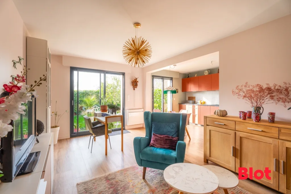 Au rez-de-chaussée, elle se compose d'une belle pièce de vie lumineuse avec cuisine ouverte aménagée et équipée, donnant sur un petit jardin clos bien entretenu, ainsi qu'une chambre et un cellier.