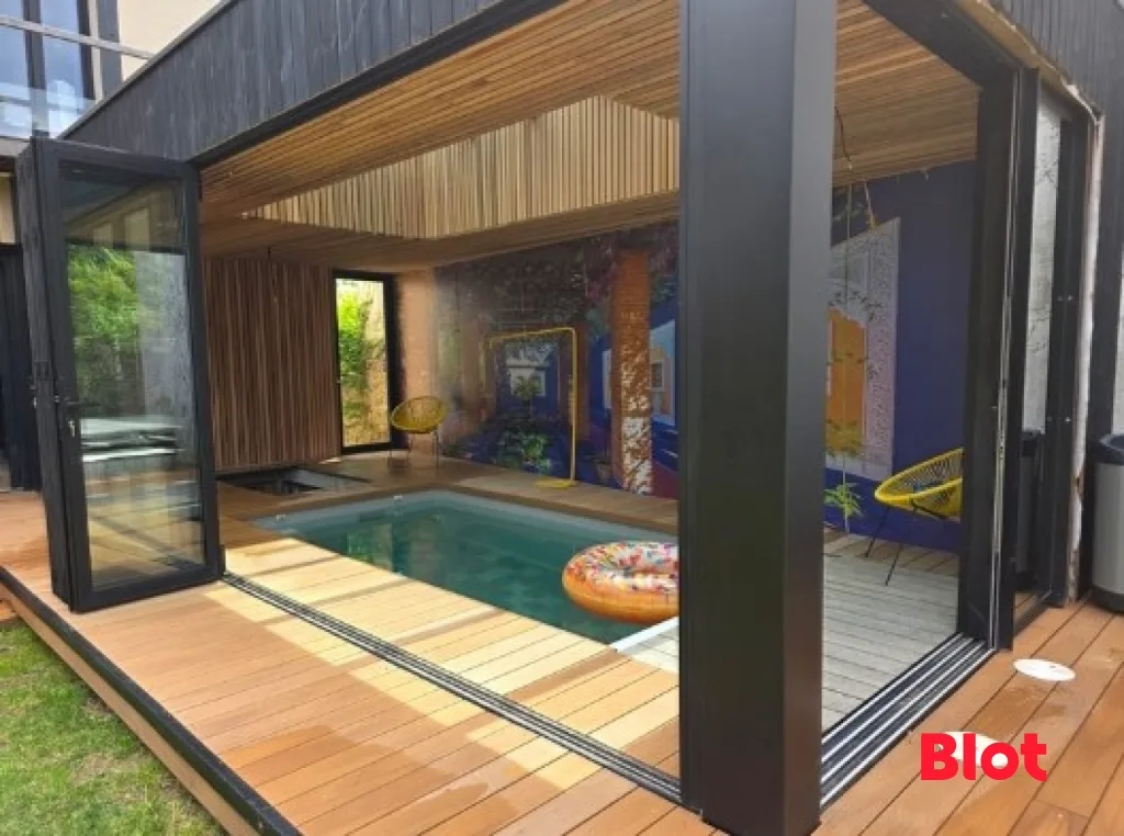 Elle propose une vaste pièce de réception lumineuse de 49 m² avec parquet chevron et cheminée, une cuisine aménagée ouverte sur la terrasse et le jardin clos de murs, sans vis-à-vis. Une piscine intérieure chauffée avec nage à contre-courant complète cet espace rare en cœur de ville.