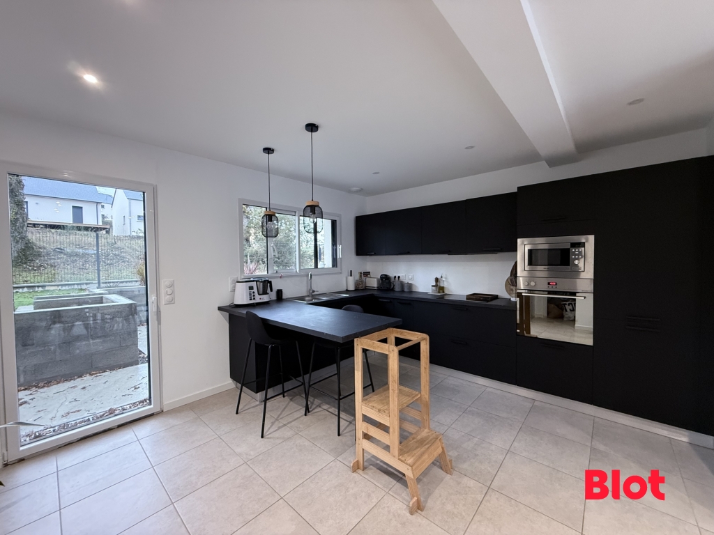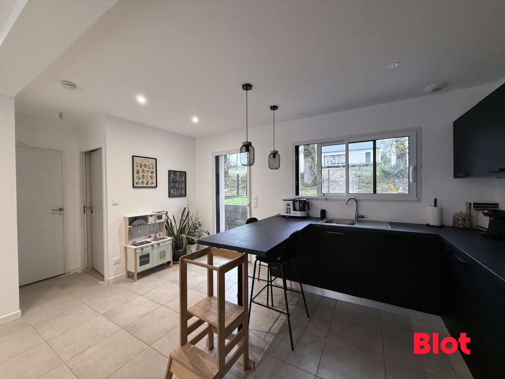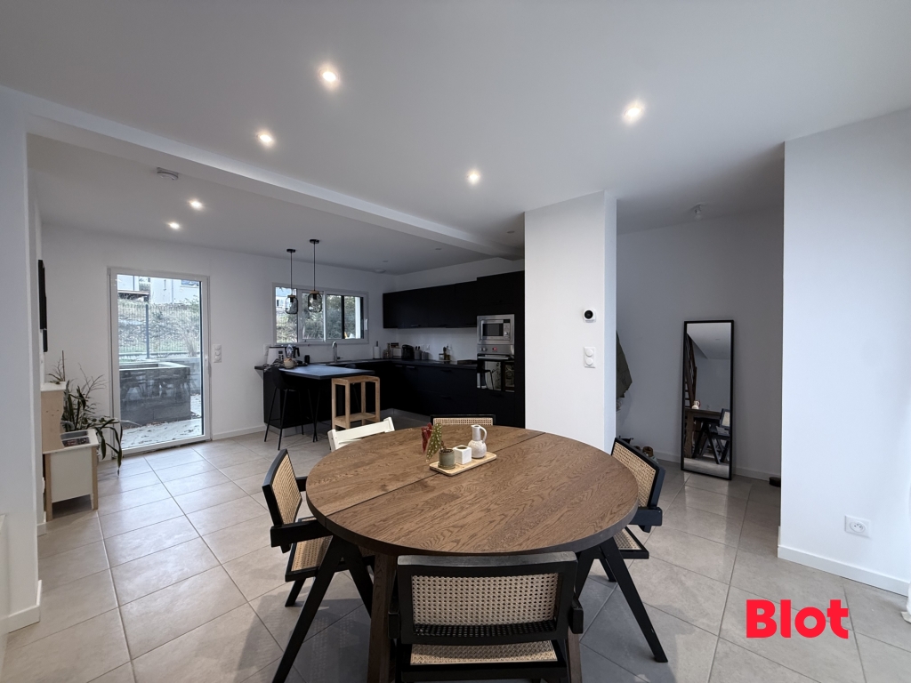 Au rez-de-chaussée vous y trouverez une cuisine toute équipée et aménagée ouverte sur une grande pièce de vie, une buanderie et un WC. A l'étage un dégagement dessert trois chambres dont une avec dressing et les deux autres avec placards, une salle de bain et un WC séparé. Elle dispose également d'un garage à vélo (7m²50) avec car-port de 16.32m². Vous pourrez profiter d'un jardin et de sa terrasse.
