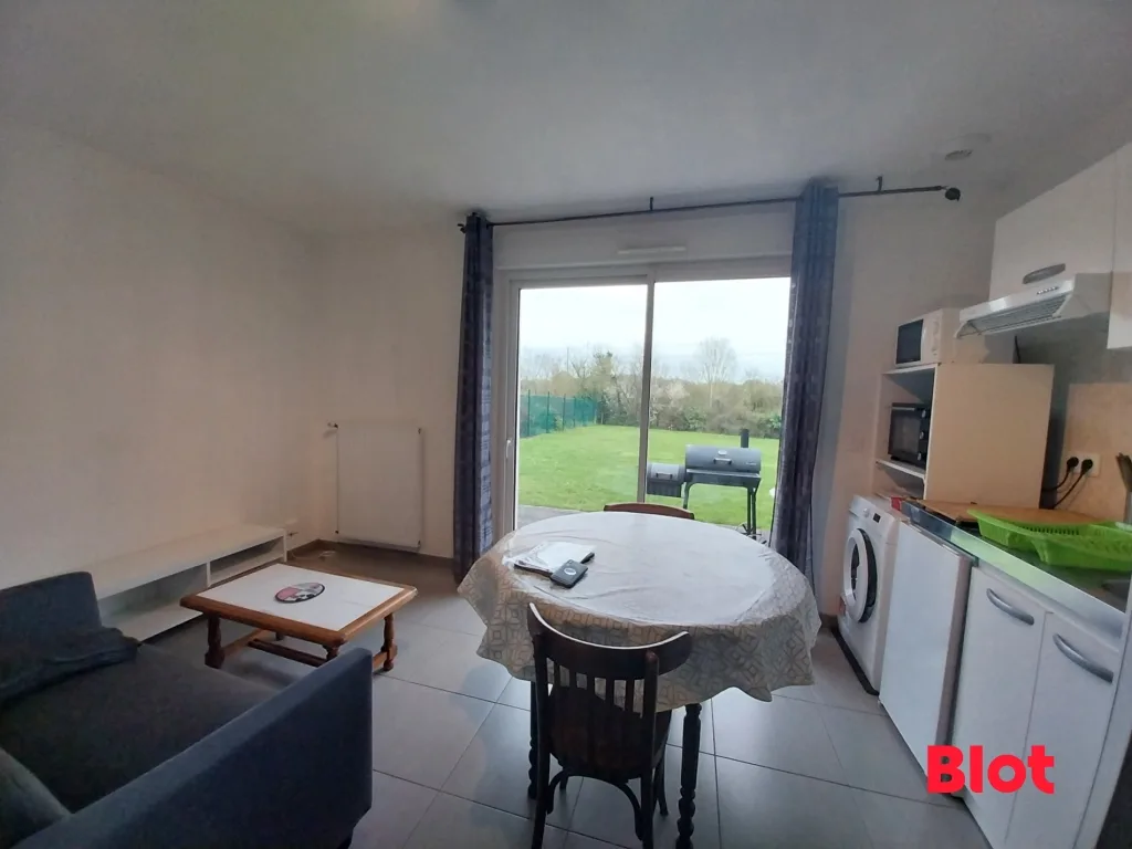 Bruz - Ker Lann - MEUBLE - Environnement calme et agréable, à deux pas du Campus, appartement Meublé, 2 pièces d'environ 33 m². Il offre une pièce de vie ouverte sur une cuisine aménagée et équipée (plaques, four micro-onde, machine à laver), une chambre et une salle d'eau avec wc. Une belle terrasse et une place de parking complètent le tout.