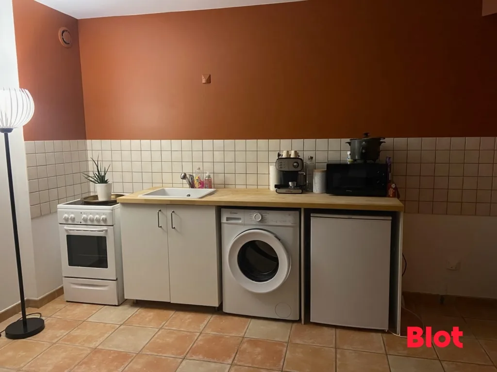 - au rez-de-chaussée : une belle pièce de vie exposée nord/sud avec cuisine aménagée et équipée (cuisinière, réfrigérateur, machine à laver) et placard.