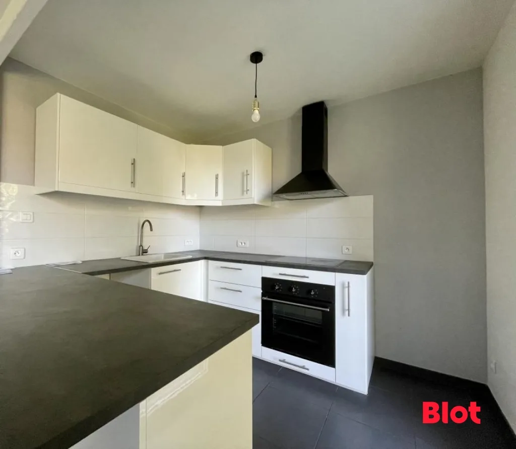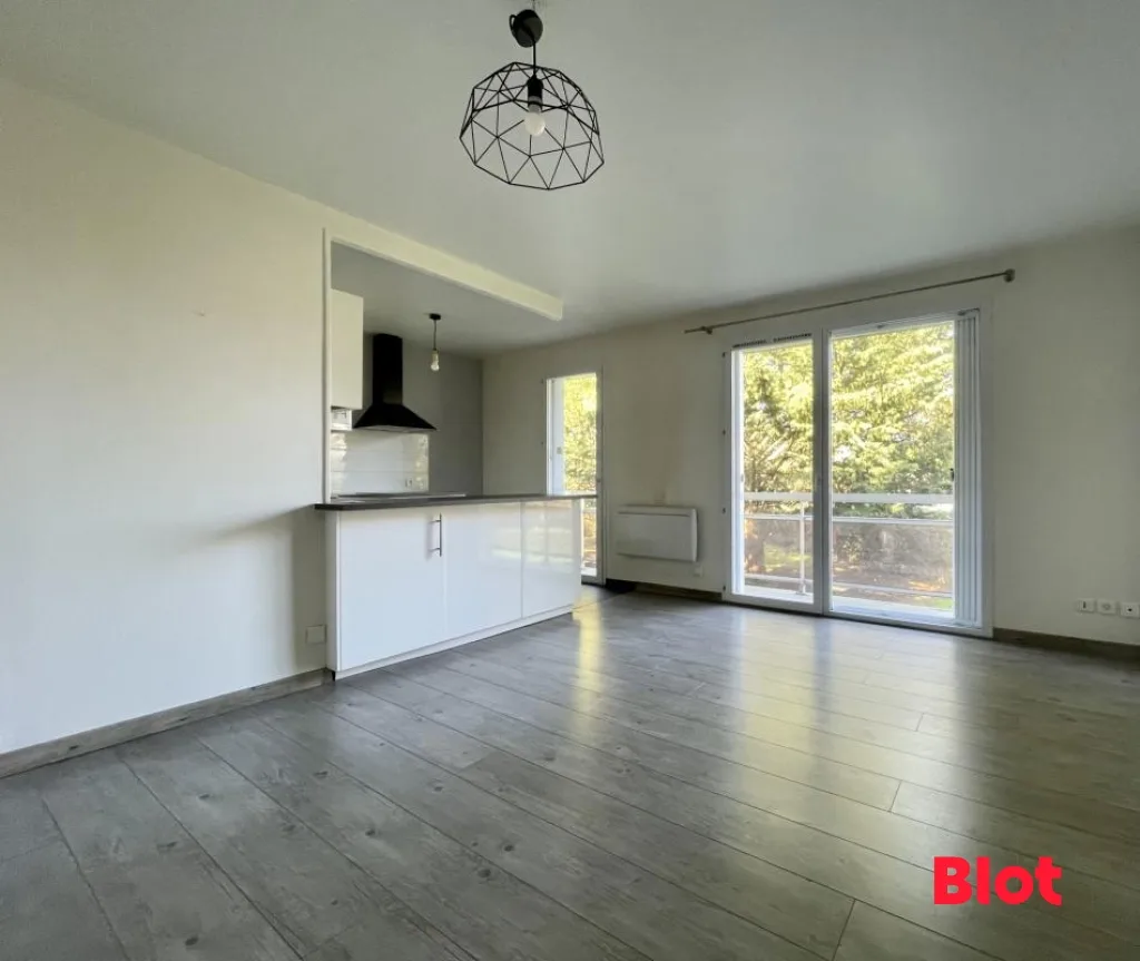 Le salon est ouvert sur une cuisine aménagée et équipée (four, plaques, hotte) ainsi que sur un balcon pour profiter d'un espace extérieur calme et sans vis-à-vis.