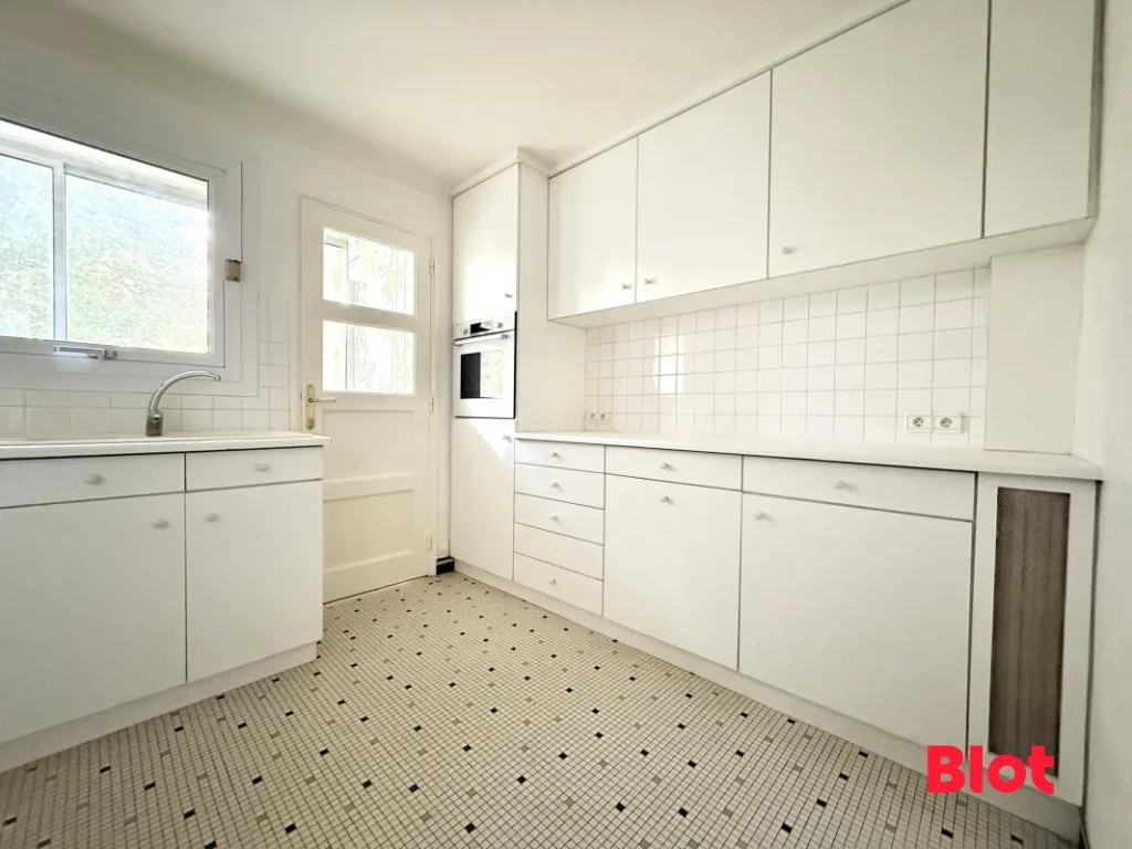 Ce logement se compose d'une grande pièce de vie, d'une cuisine aménagée (hotte, plaque, four), de deux chambres avec placards sur parquet donnant sur jardin, ainsi que d'une salle de bain et de WC séparés.
