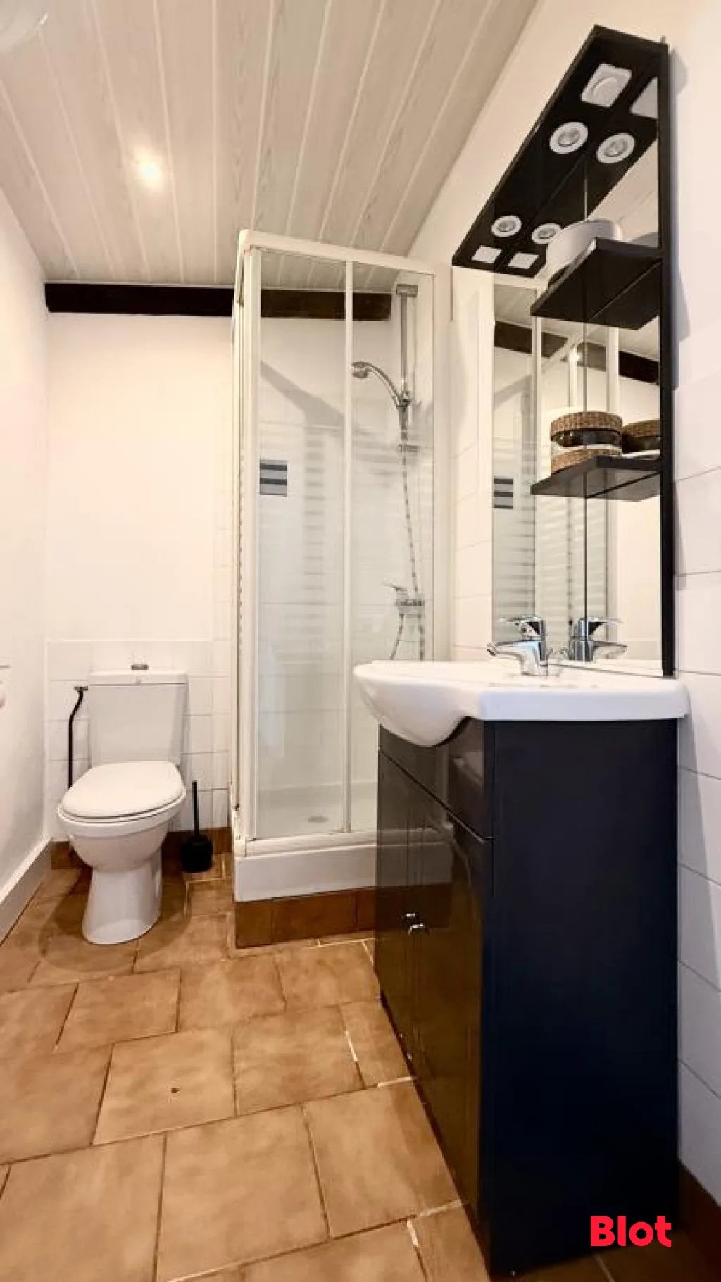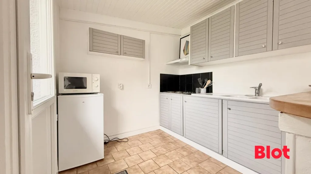 L'appartement se compose d'un beau séjour avec cuisine ouverte aménagée et équipée (plaque électrique, réfrigérateur, micro-ondes) et d'une salle d'eau avec WC. Accès sur un agréable jardin fleuri commun.
