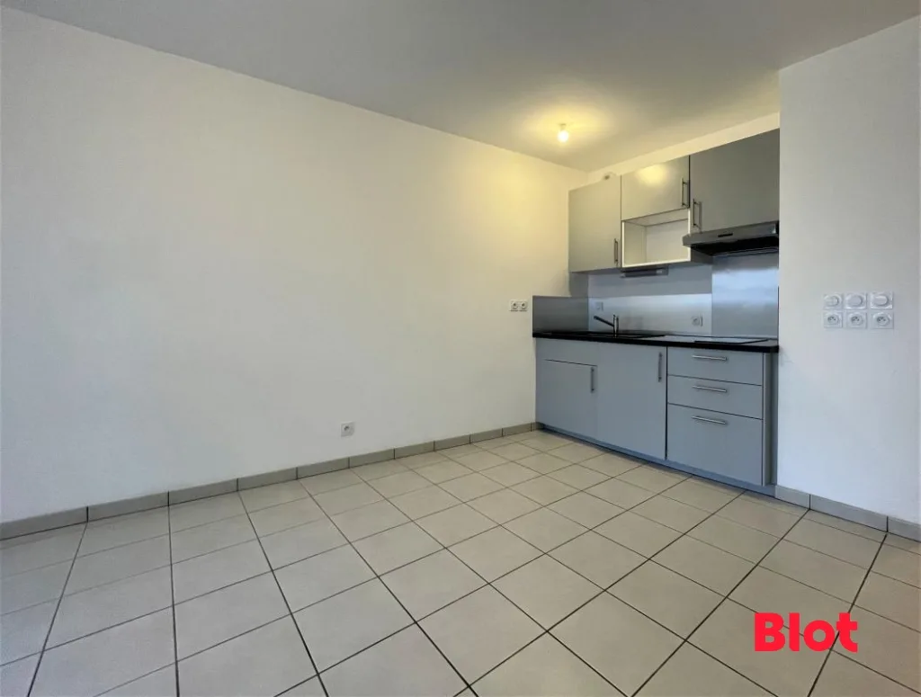 L'appartement comprend une entrée, une grande pièce de vie lumineuse avec une cuisine ouverte aménagée et équipée (plaques, hotte, réfrigérateur) donnant sur une terrasse avec un cellier.