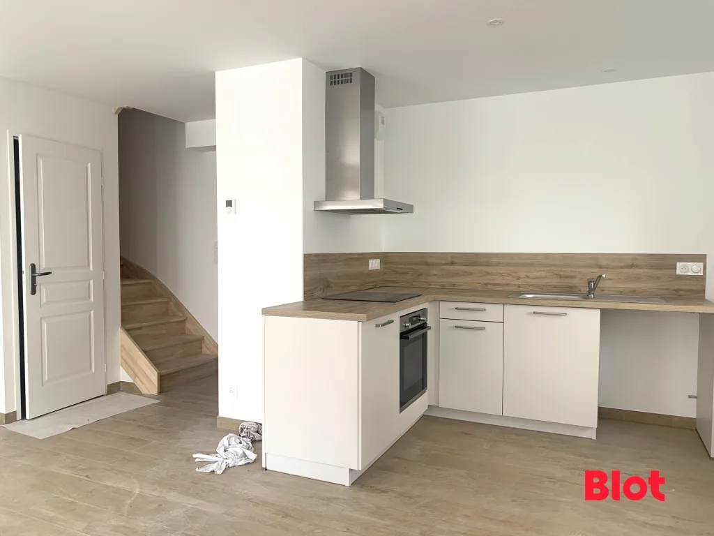 Elle se compose au rez-de-chaussée d'une pièce de vie avec cuisine aménagée/équipée (plaque, four, hotte), et d'un dégagement avec placard desservant une chambre, une salle d'eau et un wc.