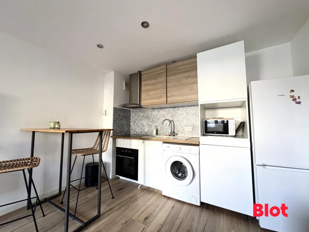 au rez-de-chaussée, d'un séjour lumineux avec cuisine entièrement équipée (plaque à induction, hotte, réfrigérateur avec partie congélateur, micro-ondes et machine à laver) ;